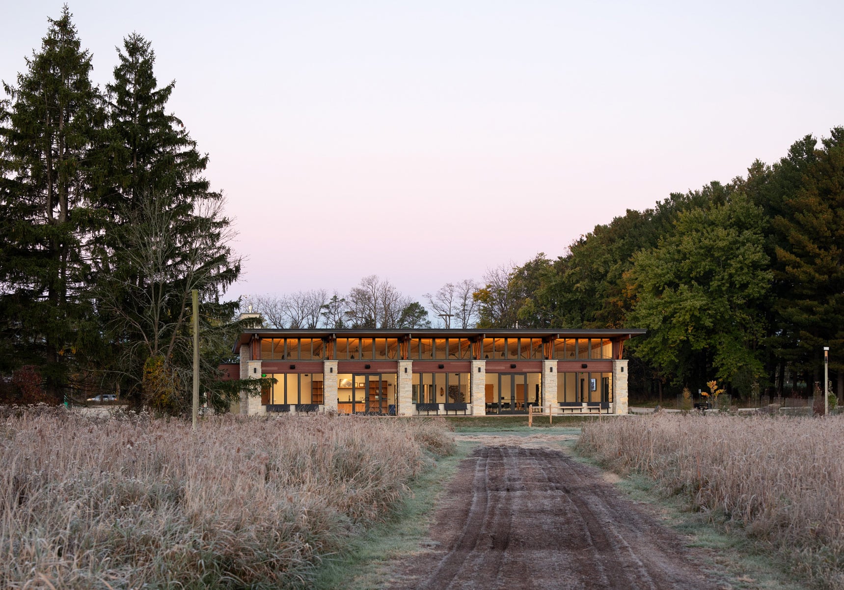 The primary goal of the Lapham Lodge project was to create a 5,000-square-foot facility that blends seamlessly with its natural setting while supporting a range of uses. The building includes a 2,300-square-foot gathering space, a 400-square-foot multipurpose room with a kitchenette, accessible restrooms, changing rooms with lockers, and a generous outdoor patio. The lodge is positioned between the Evergreen Grove parking lot and the trailhead, allowing direct access to the trail system and framed views of the surrounding landscape.