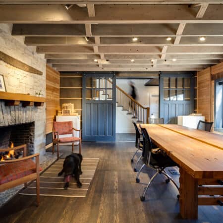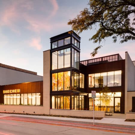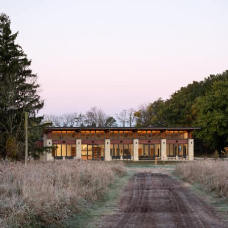 Rooted in a bluff overlooking an active stone quarry, the existing 1970s cast-in-place concrete structure gave the impression of a Cold War-era bunker rather than an office building. A section of the existing pyramid roof and riprap landscaping were removed to form a new raised exterior terrace. A natural stone veneer retaining wall and planter bed are buffers between the terrace and the adjacent parking lot. A new cedar and steel pergola and a pair of knee-height, sandblasted concrete walls extend into the existing parking lot to greet those arriving at the building, along with many more moves to elevate the space.